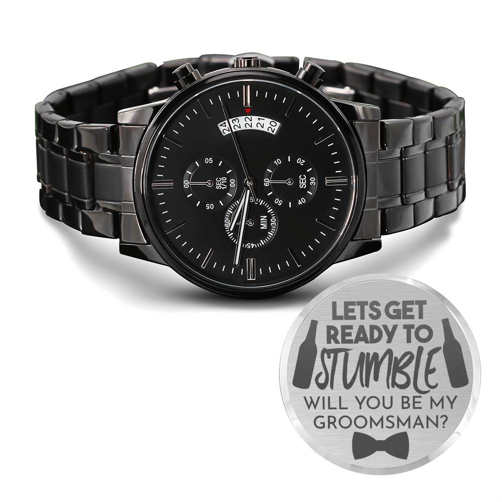 A personalized gift that can withstand constant use, this Engraved Design Black Chronograph Watch is the perfect gift for all the special men in your life. A thoughtful groomsmen gift, an anniversary memento, or a long-lasting keepsake for Father’s Day - it's a versatile piece sure to warm hearts and create smiles. Featuring a three-dial face, calendar function, and luxury pointer in a water-resistant and scratch-proof vessel.