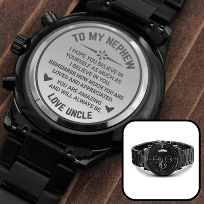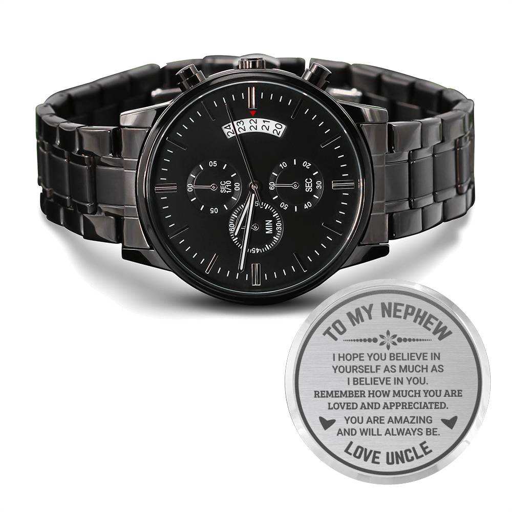 A personalized gift that can withstand constant use, this Engraved Design Black Chronograph Watch is the perfect gift for all the special men in your life. A thoughtful groomsmen gift, an anniversary memento, or a long-lasting keepsake for Father’s Day - it's a versatile piece sure to warm hearts and create smiles. Featuring a three-dial face, calendar function, and luxury pointer in a water-resistant and scratch-proof vessel.