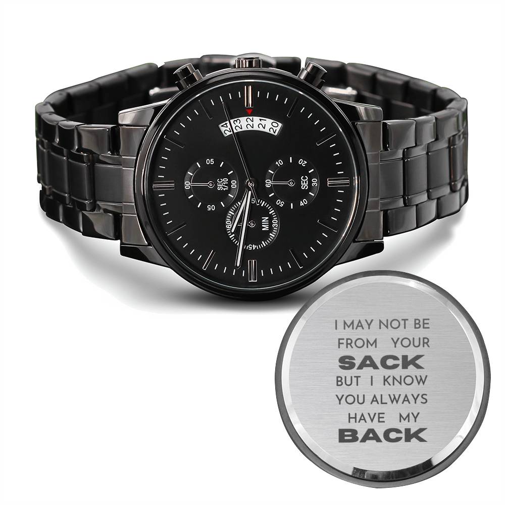 A personalized gift that can withstand constant use, this Engraved Design Black Chronograph Watch is the perfect gift for all the special men in your life. A thoughtful groomsmen gift, an anniversary memento, or a long-lasting keepsake for Father’s Day - it's a versatile piece sure to warm hearts and create smiles. Featuring a three-dial face, calendar function, and luxury pointer in a water-resistant and scratch-proof vessel.