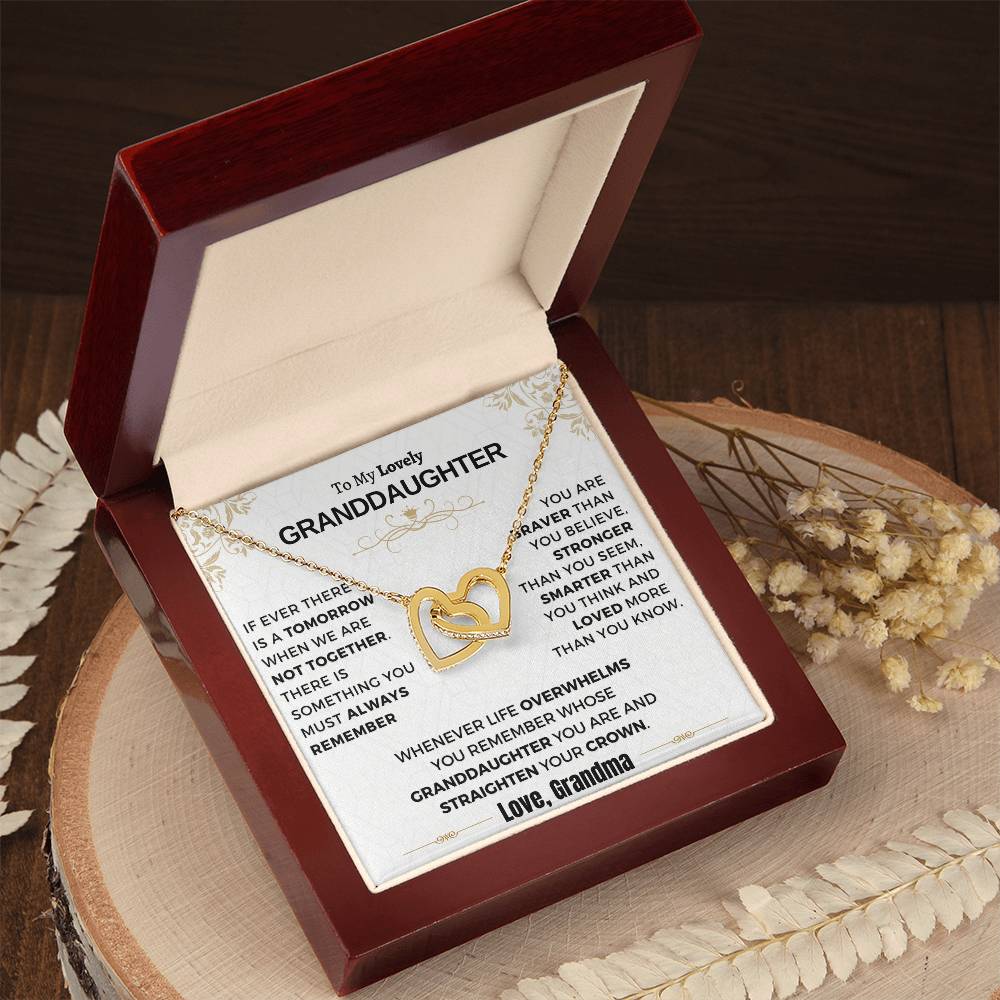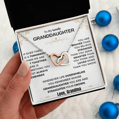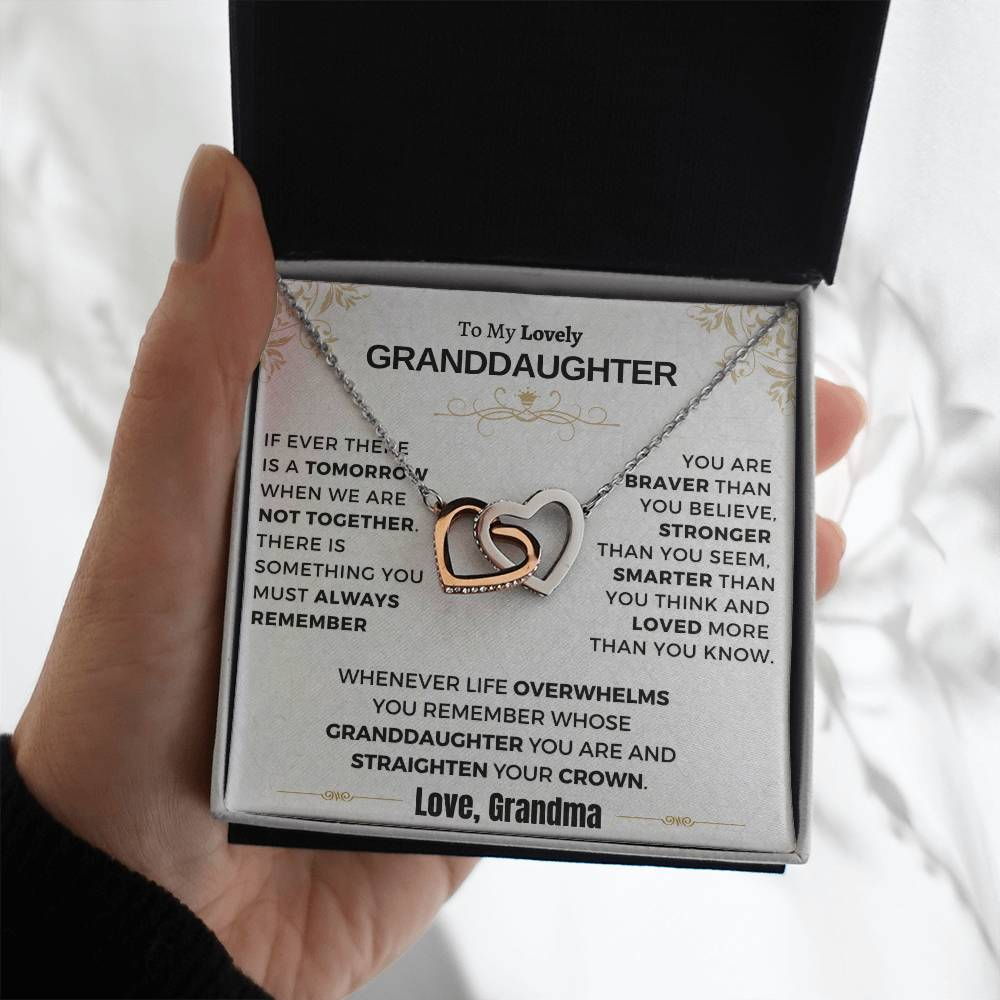 Artisan-crafted interlocked hearts necklace: Symbolizing the unwavering love of a grandparent for a granddaughter, this necklace boasts two hearts, one in silver and one in rose gold, adorned with AAA+ cz crystals.