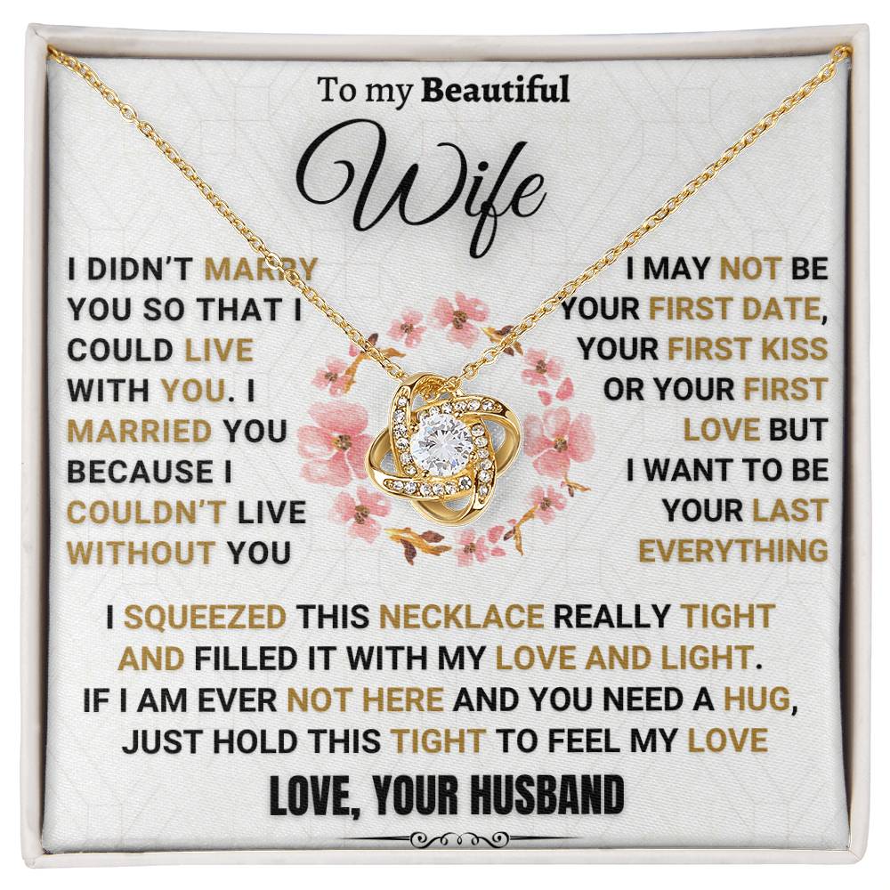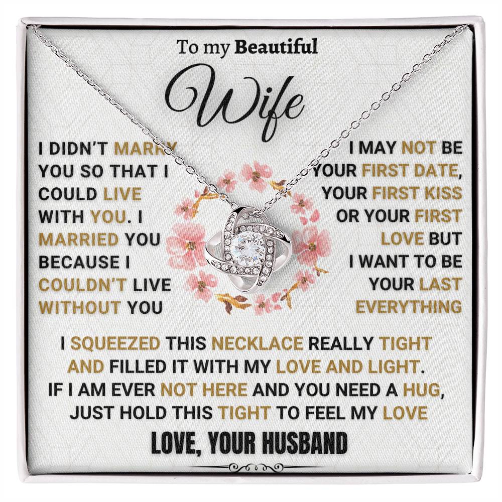 The Message Says: "To My Beautiful Wife - I didn't marry you so that I could live with you, I married you because I couldn't live without you. I may not be your first date, your first kiss or your first love but I want to be your last everything. I squeezed this necklace really tight and filled it with my love and light. if I am ever not here and you need a hug just hold this close to feel my love"  Love, Your Husband